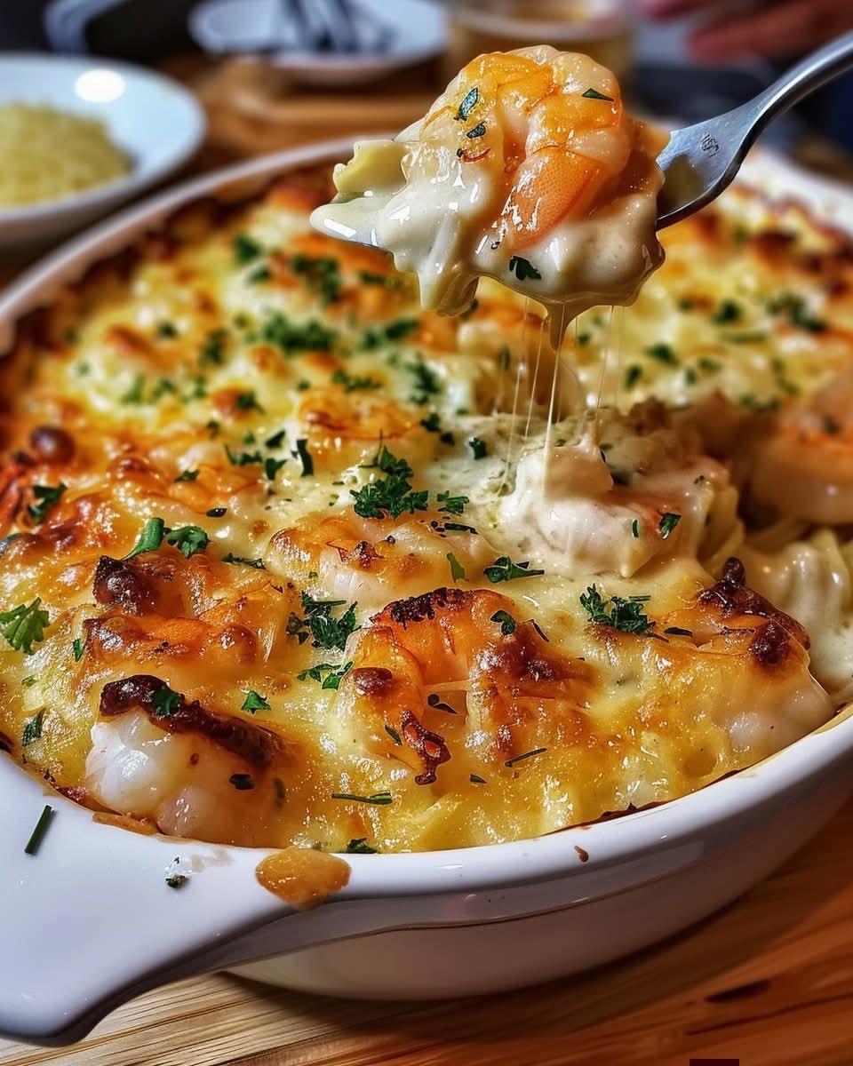 Transfer the creamy seafood mixture to the prepared casserole dish, spreading it evenly. In a small bowl, mix breadcrumbs, Parmesan cheese, and chopped parsley. Sprinkle this topping evenly over the seafood mixture.
