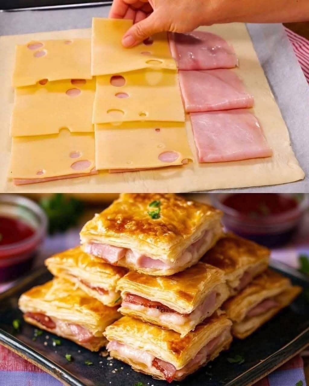 3. Place ham and cheese in the center of each square. Leave a 1-inch border.