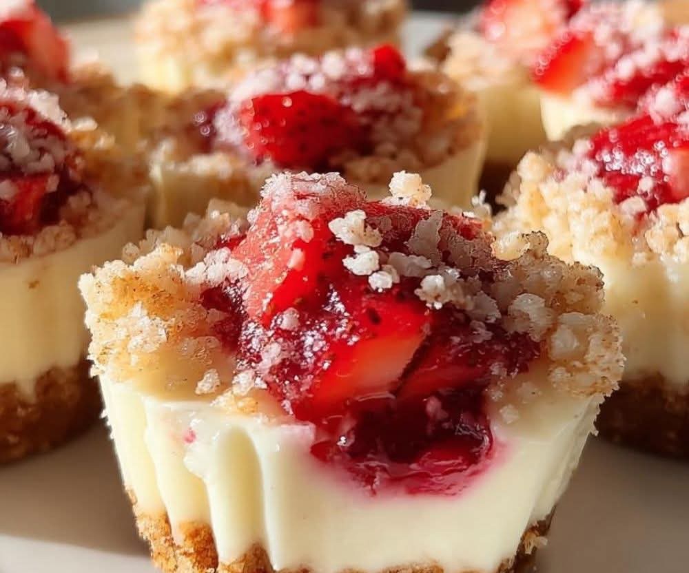 8. Sprinkle the crispy rice cereal and remaining strawberries on top of each cheesecake bite.