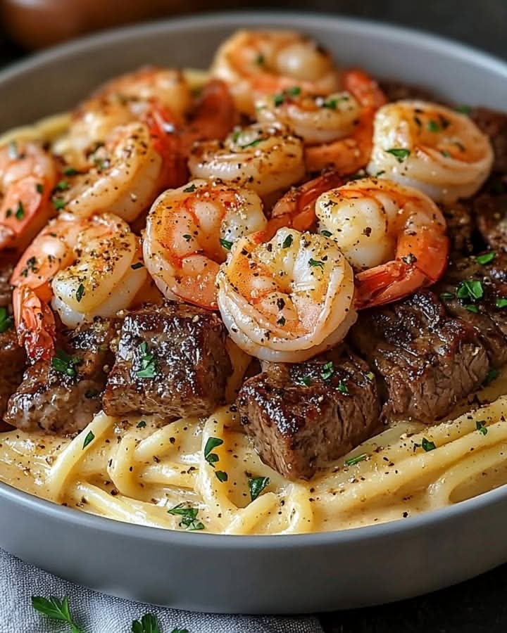 Divide the pasta among plates, garnishing with fresh parsley. Serve hot and enjoy the bold flavors of Cajun Shrimp and Steak Alfredo Pasta!