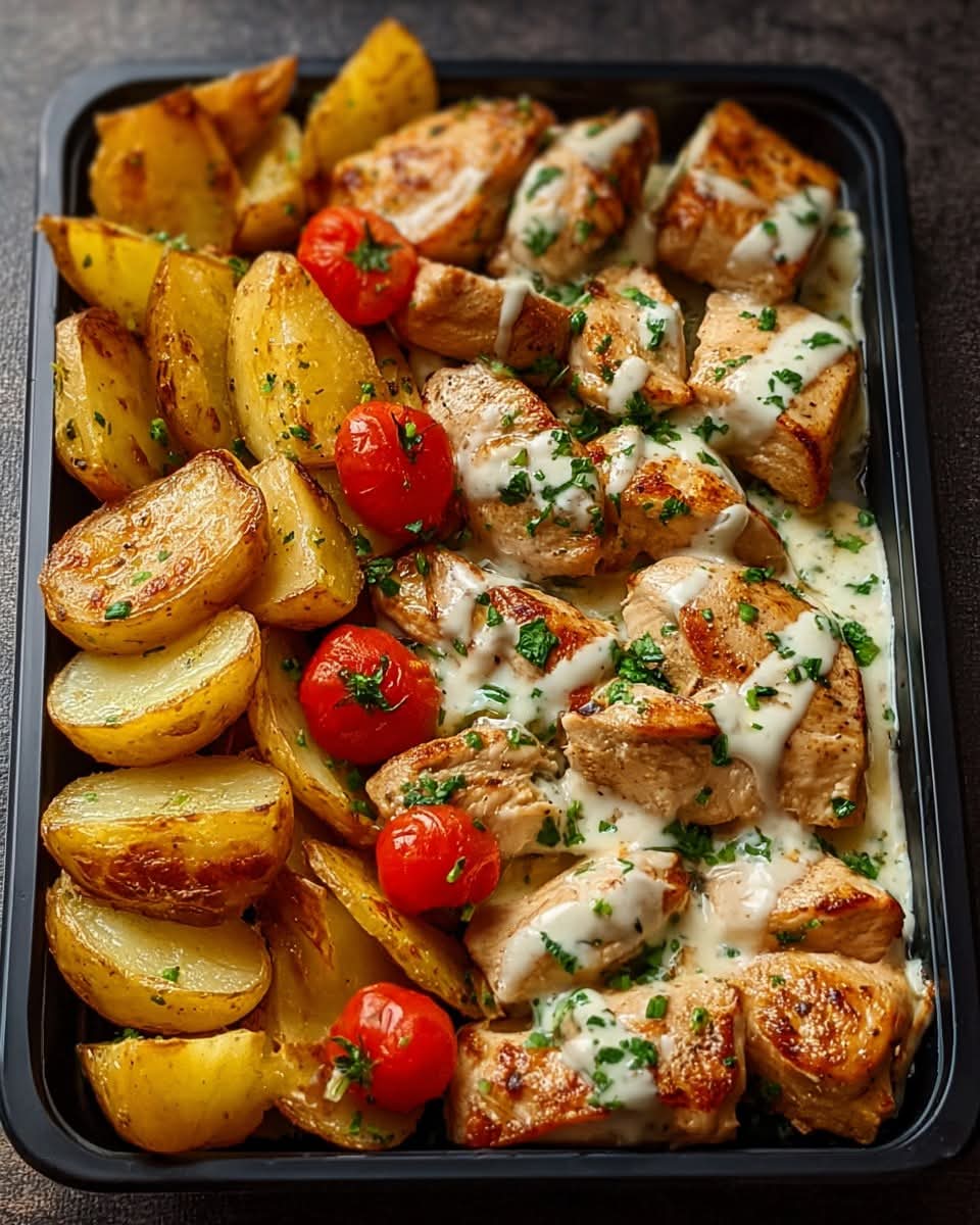 Creamy Garlic Chicken Bites with Crispy Potatoes & Burst Tomatoe