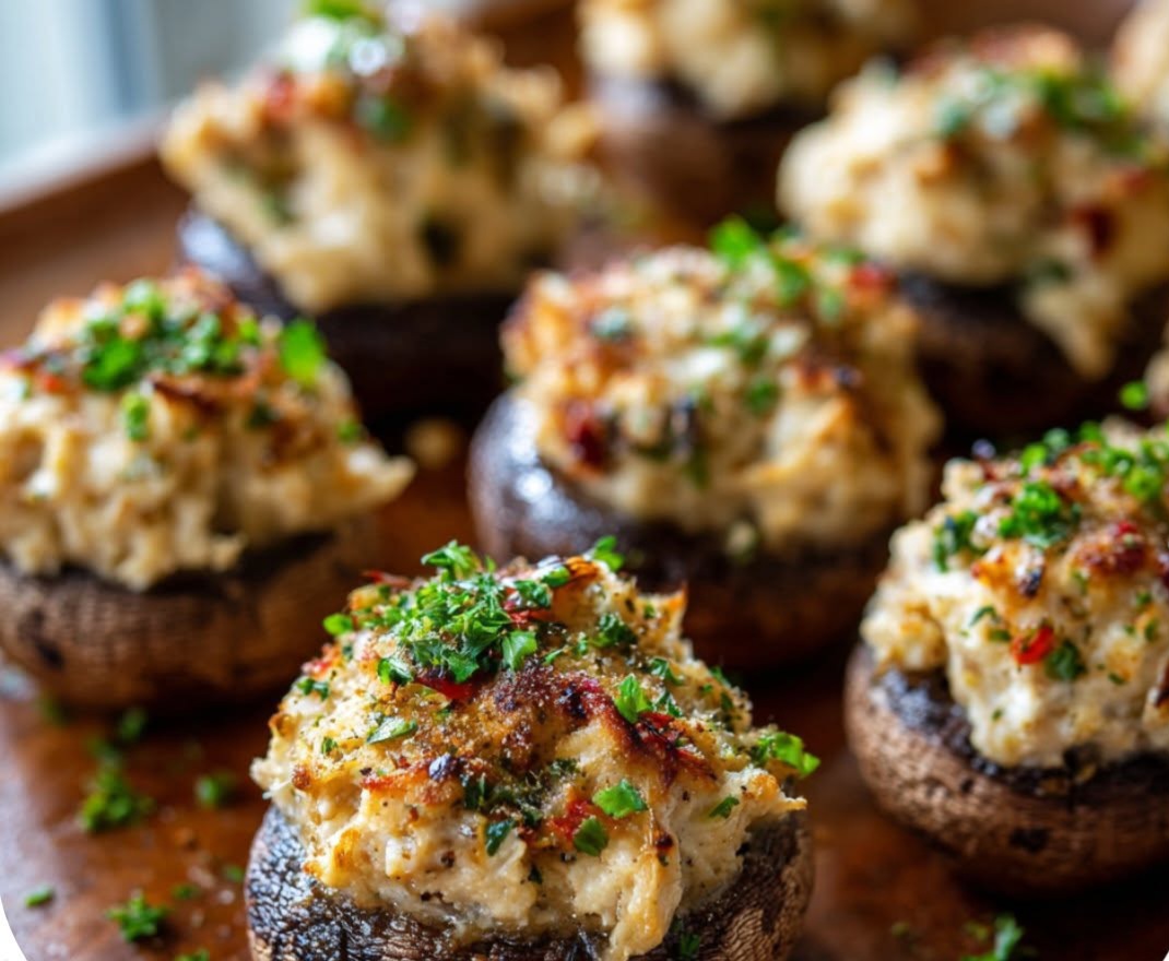 Creamy, savory crab-filled mushrooms baked to golden perfection — a perfect appetizer for parties or special dinners.