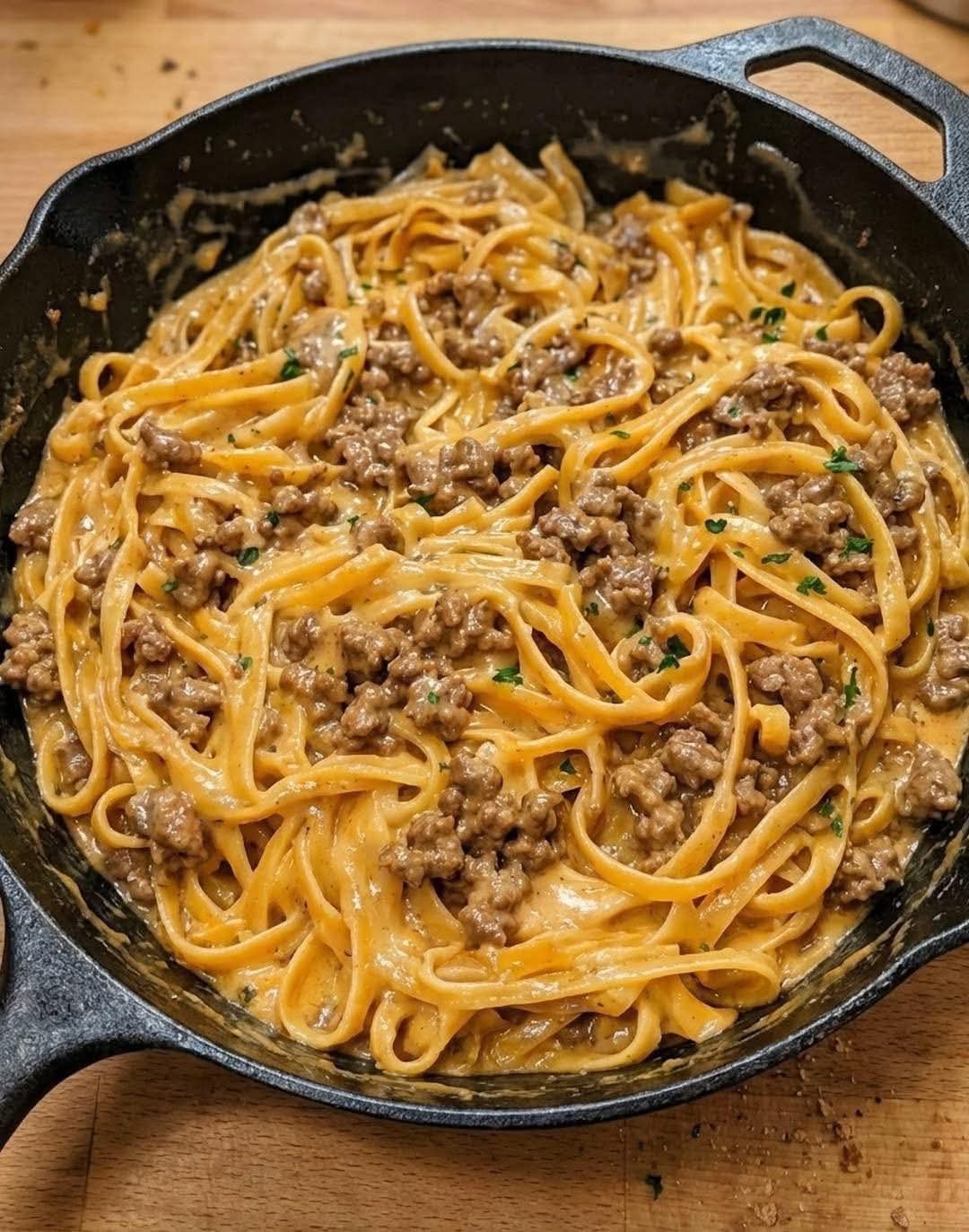 Add beef back to the skillet. Pour in beef broth (or pasta water) and simmer for 1–2 minutes. - Add pasta