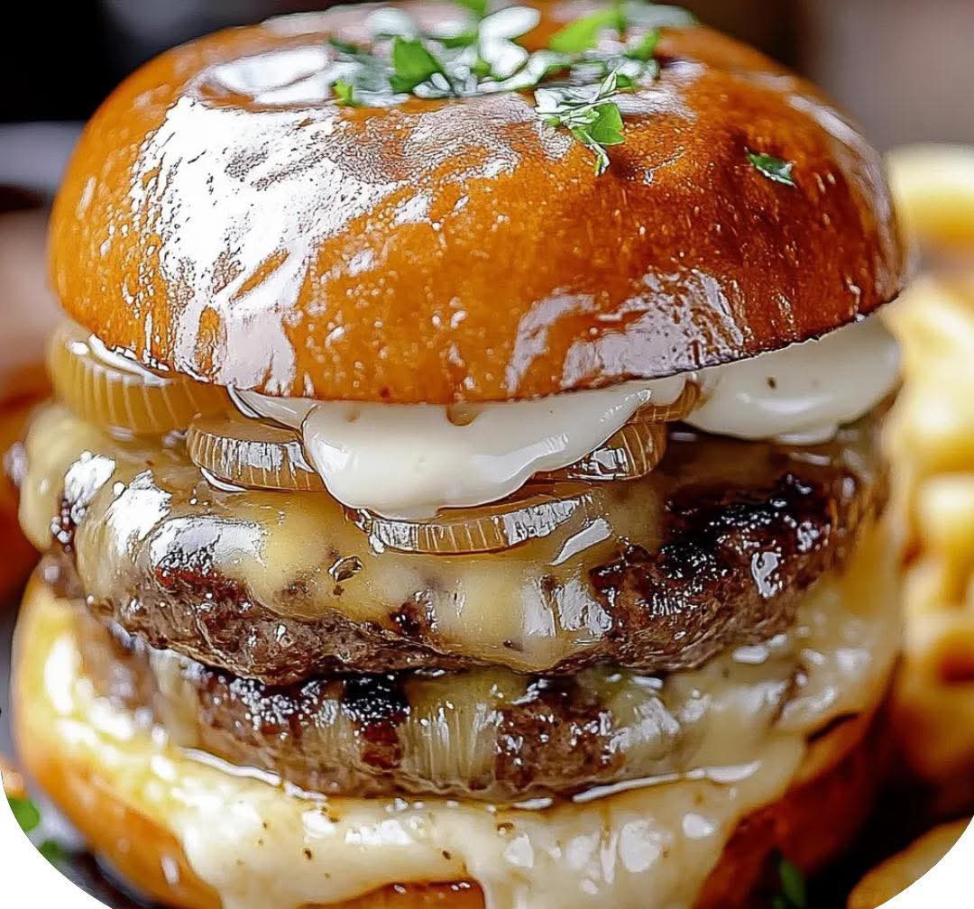 Juicy burgers inspired by classic French onion soup, topped with sweet caramelized onions and melted cheese