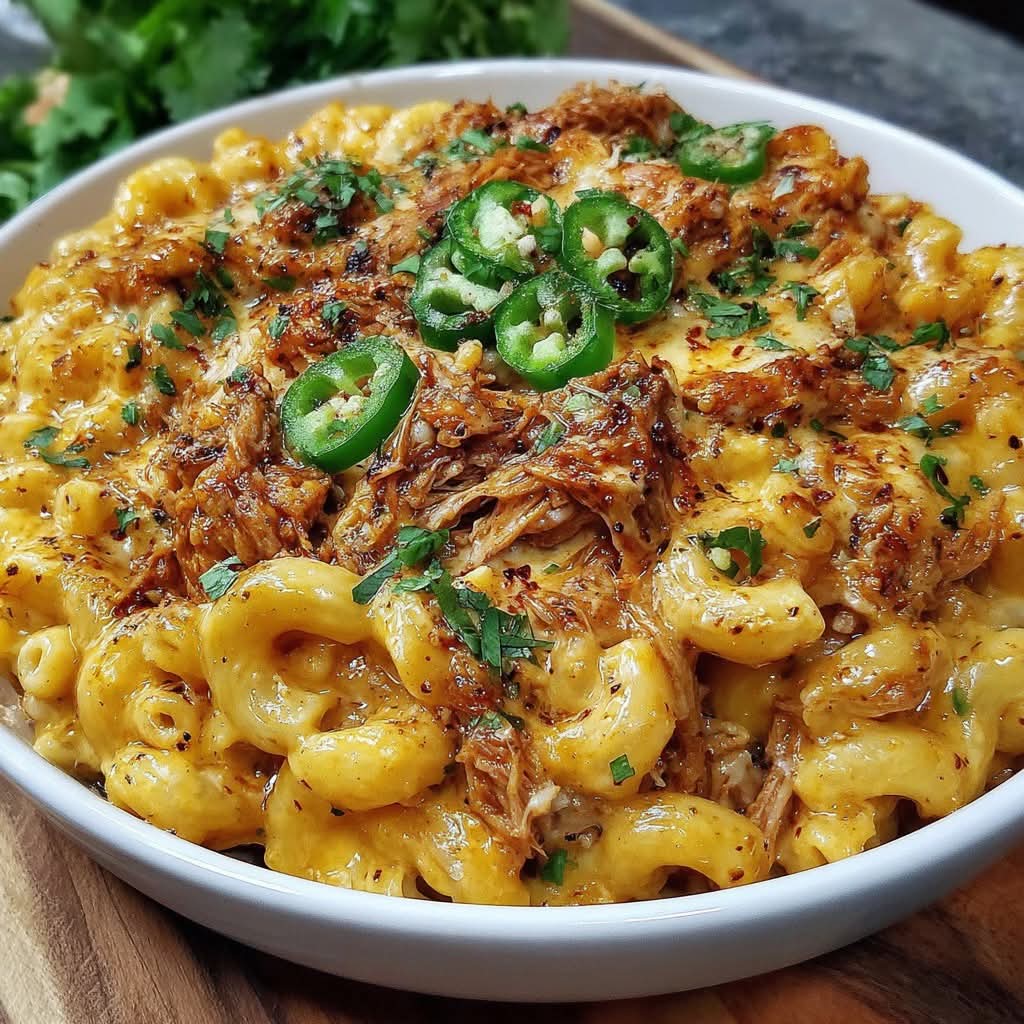 A rich and indulgent comfort dish combining creamy mac and cheese with smoky BBQ pulled pork — perfect for game day or a hearty dinner.