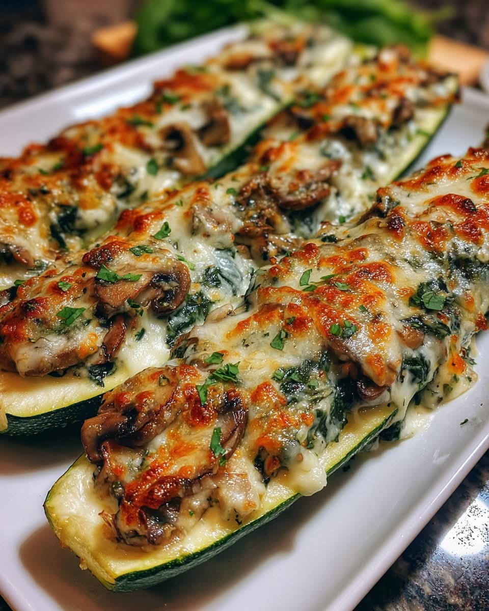 Tender zucchini boats stuffed with a creamy, savory mixture of ricotta, sautéed mushrooms, and spinach, then baked until perfectly golden.