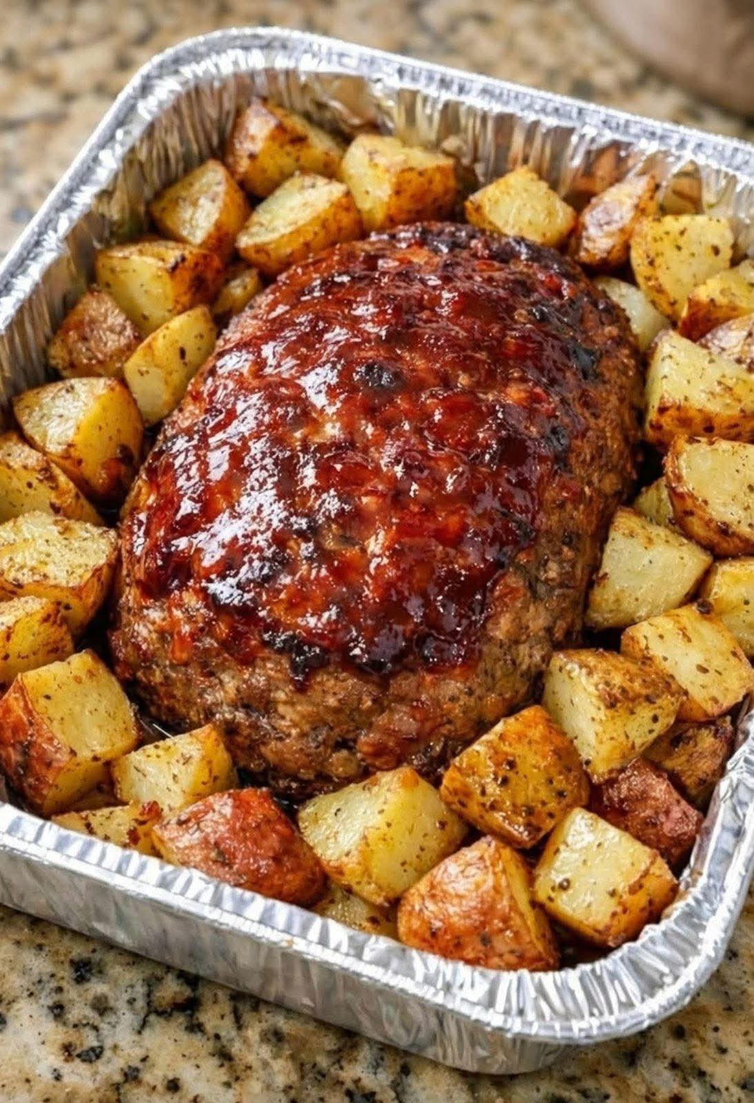 - Bake for 50–60 minutes, or until the meatloaf is fully cooked and the potatoes are golden brown and tender.