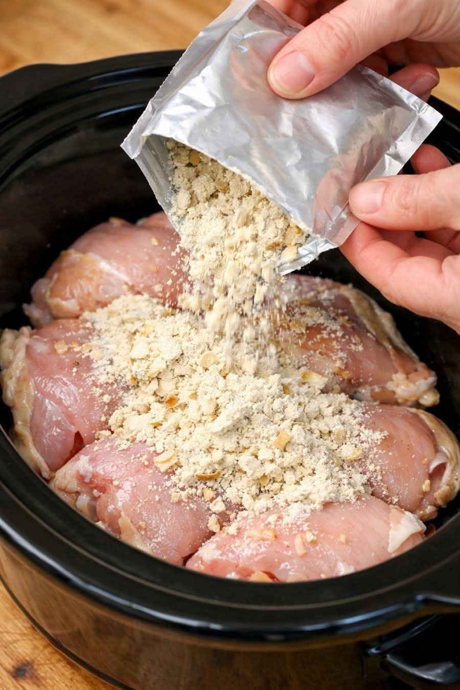Place the chicken thighs in the bottom of the slow cooker in a single layer if possible. Pour the creamy onion mixture evenly over the chicken, making sure each piece is well coated. - Cook low and slow:
