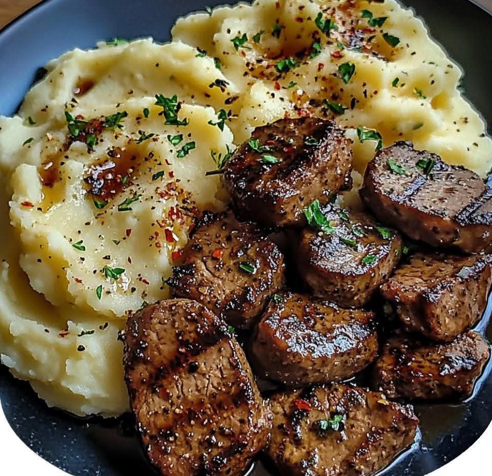Tender steak bites coated in garlic butter, served over smooth, fluffy mashed potatoes — pure comfort food!