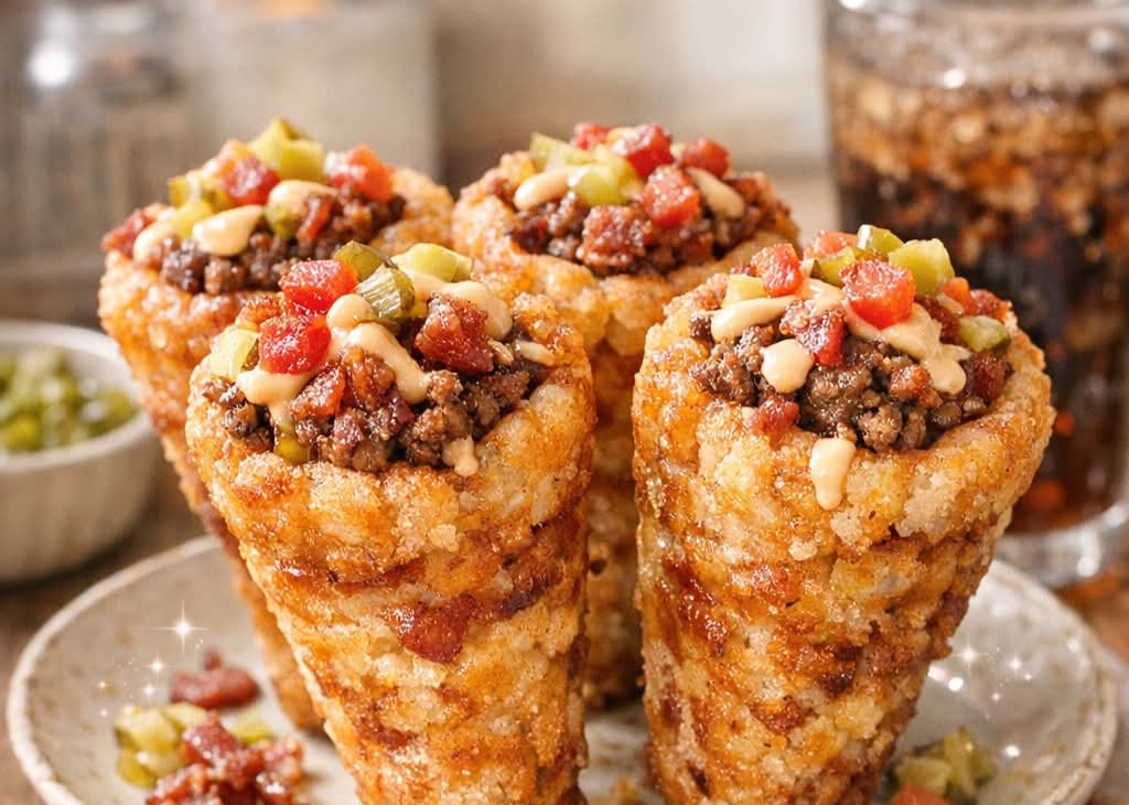 - Remove from oven and carefully press the tots against the sides to form a cone or cup shape.