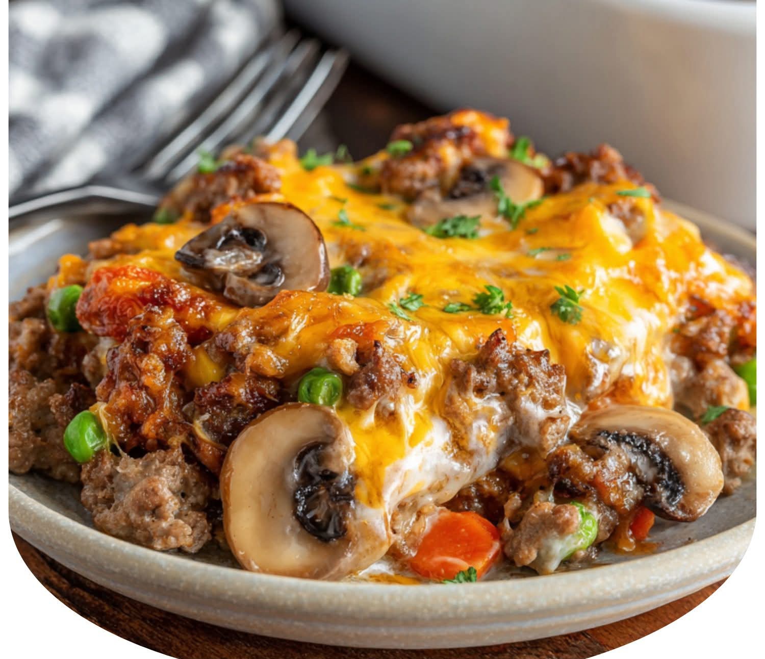 A hearty, comforting casserole loaded with seasoned beef, veggies, and rich creamy sauce topped with melty cheese!
