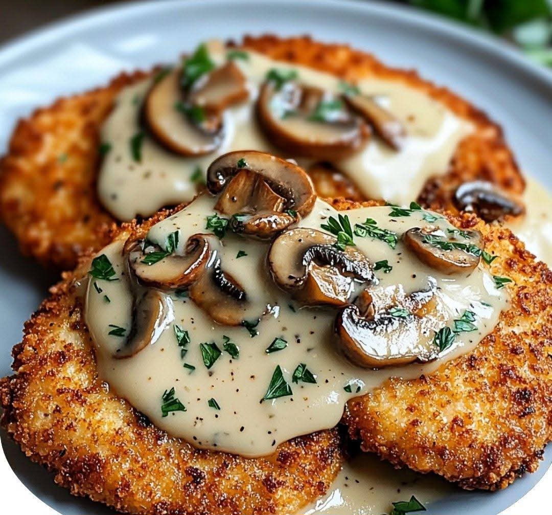 Crispy golden chicken with a rich, creamy, cheesy mushroom sauce — restaurant-style comfort food at home!