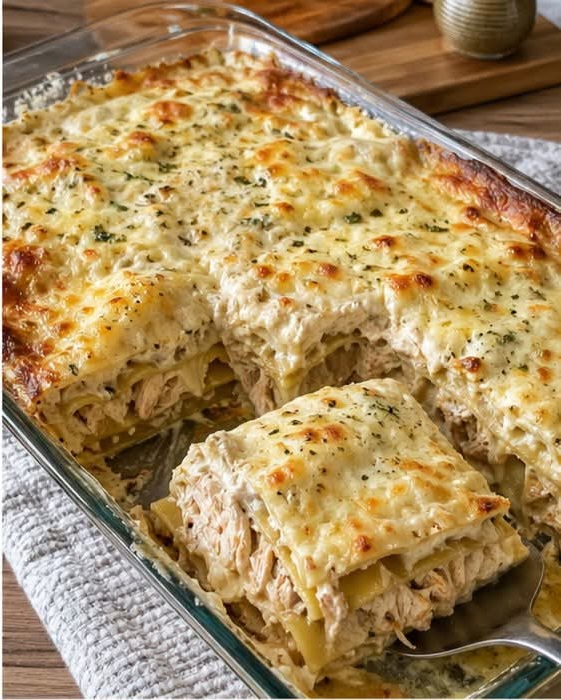 Layer lasagna sheets, creamy chicken filling, and cheese.
