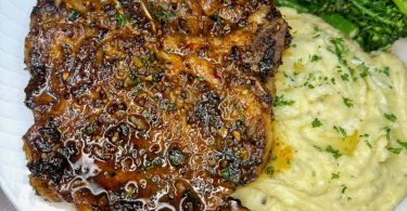 Honey Garlic Pork Chops with Creamy Yukon Gold Mashed Potatoe Juicy, pan-seared pork chops coated...