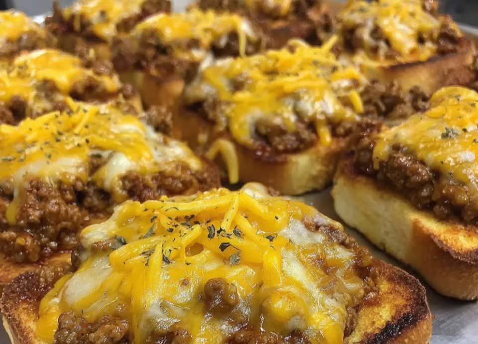CHEESY SLOPPY JOE GARLIC TOAST Tangy homemade sloppy joe piled high on crispy garlic toast and smothered with melted cheddar—comfort…