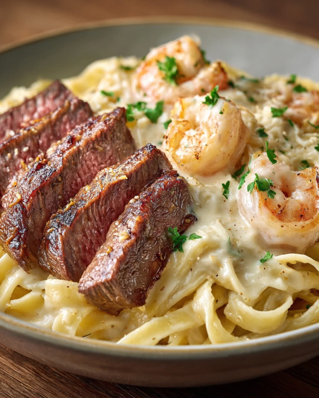 STEAK & SHRIMP ALFREDO Juicy steak slices and tender shrimp tossed in a silky, cheesy Alfredo sauce over fettuccine. Elegant…